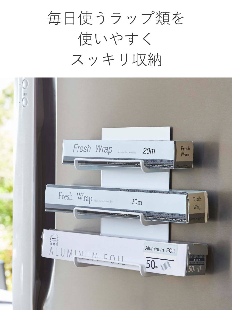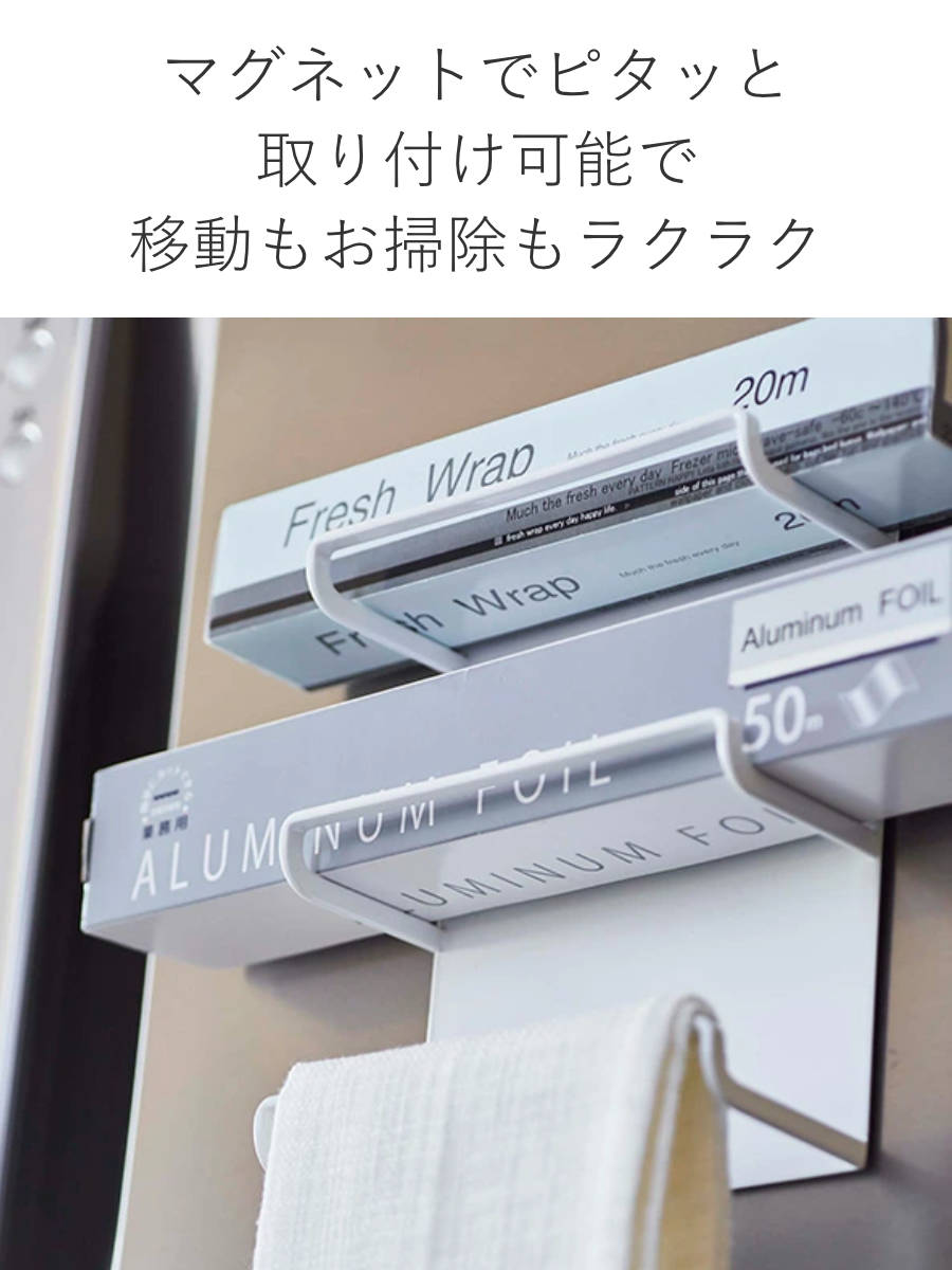 ●強力マグネットで冷蔵庫にくっつけるだけ!ラップやホイルを置くだけで簡単に収納できます。