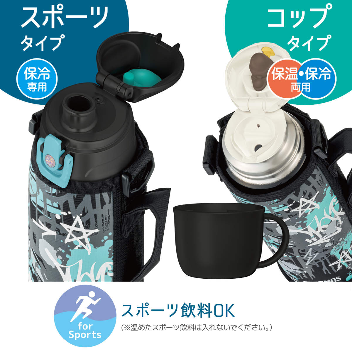 ●直接飲める保冷専用のスポーツボトルと、中栓を付ければ保温・保冷両用になるコップタイプの1Lサイズの2WAYボトルです。