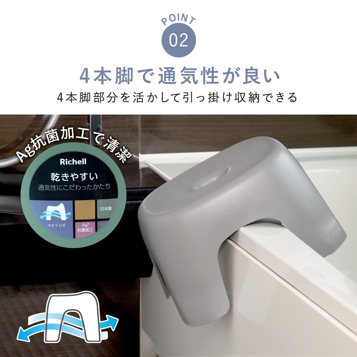 ●4方向から空気が流れやすいので、風呂椅子の内側に湿気がこもることを防ぎ素早く乾きます。