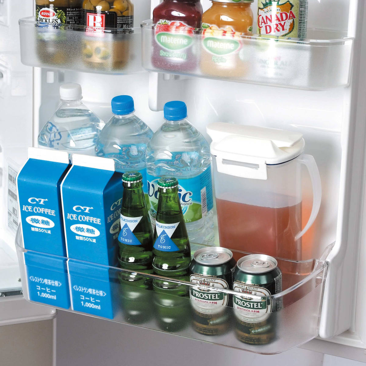 ●冷蔵庫のドアポケットにすっきり収納できます。