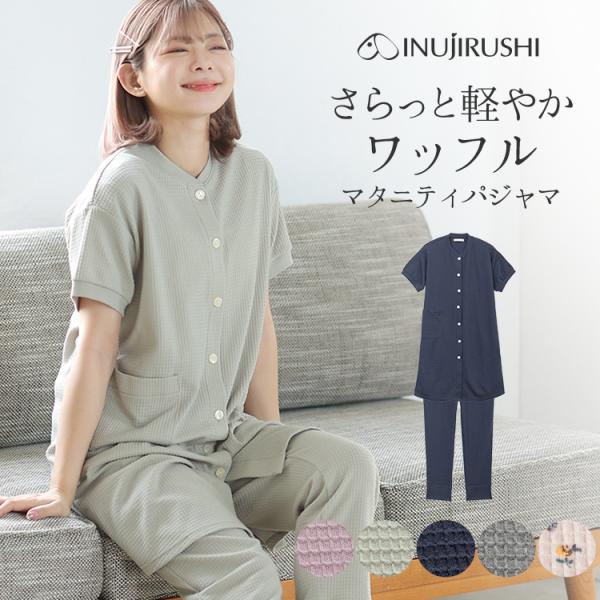 犬印本舗 マタニティパジャマ ワッフル 半袖 襟なし 前開き 産前 産後 授乳服 ピンク グリーン ネイビー 夏 授乳パジャマ マタニティー ルームウェア