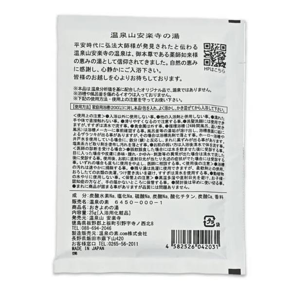 本商品は、温泉山安楽寺の温泉分析値を基に配合された入浴剤(1回分)となります。