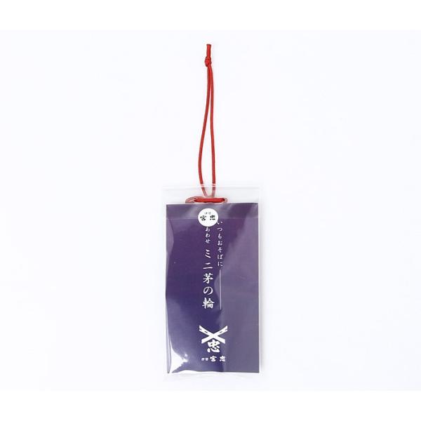 小振りな茅の輪に、木曽桧製の蘇民木札を祓い清めの意味をもつ麻苧で結びつけました。