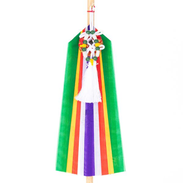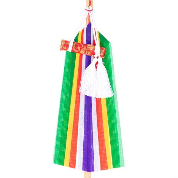 神事の場で祭壇の左右に立てる祭具です。緑・黄・赤・白・青の五色絹の幟の先端に榊を立て、三種の神器を掛けたものです。向かって左側に剣を掛けたものを立て、右側に鏡と勾玉を掛けたものを立てます。