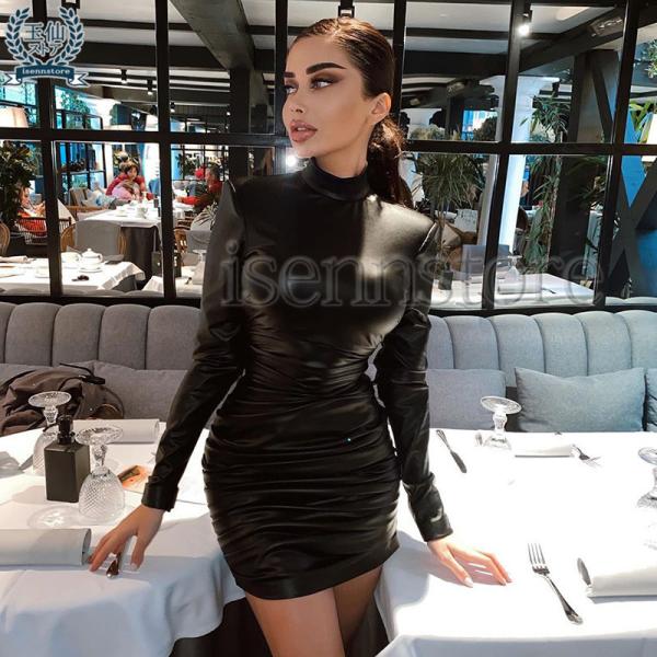 ギャザーワンピース 秋冬 フェイクレザー ミニ丈ワンピース 長袖 ハイネック タイトワンピ レディース PU革 セクシー ボディコンワンピース 欧米 スタイリッシュ