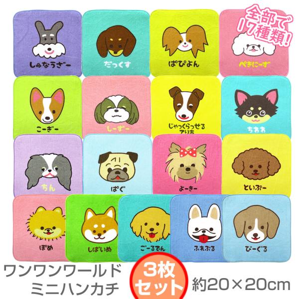 ワンワンワールド ミニハンカチ3枚セット 約20×20cm ふわふわ 柔らか シャーリング 染料プリント 犬柄 いぬ わんこ 保育園 幼稚園 粗品