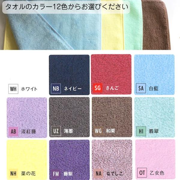 タオルカラーは(全11色)と、フォント(3パターン)、刺繍糸(2色)の組み合わせて自分好みのデザインが楽しめます。