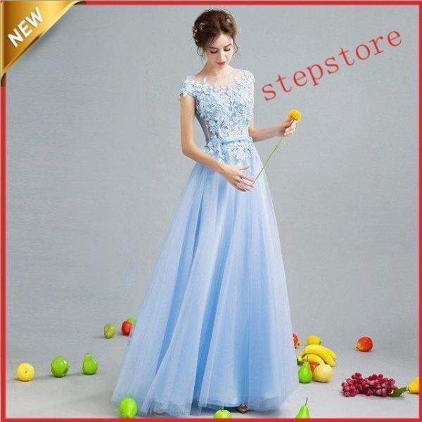 パーティドレス 水色 ロング丈 ロンドレス 背開き 編み上げ 発表会ドレス 演奏会ドレス ライトブルー イブニングドレス Aライン パーティードレス
