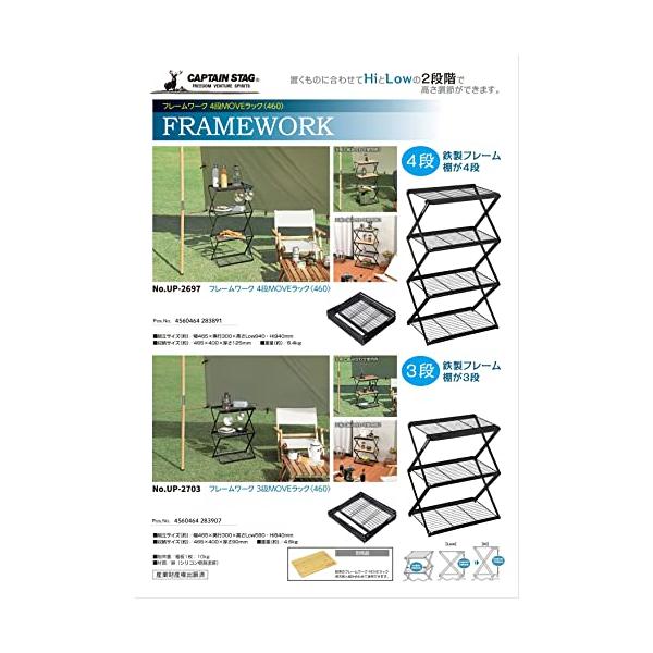 置くものに合わせてHiとLowの2段階で高さ調節ができます。鉄製フレーム。棚が4段キャンプ・バーベキューのアウトドアにも、