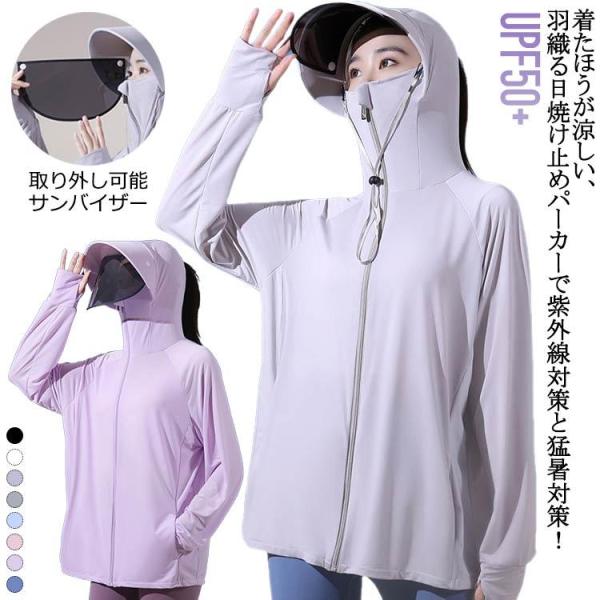 つば付き 接触冷感 日除けパーカー レディース アウター パーカー 手の甲まですっぽり マスク付き UVパーカー 360度保護 UPF50 ラッシュ