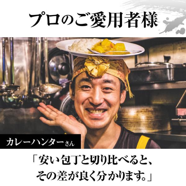 【家庭でもプロの切れ味】精密に薄く仕上げられた刃は、切断の抵抗を最小限に抑え、高い切れ味を実現します。素材にはサビに強く、切れ味の良い、高級ステンレスのモリブデン バナジウム鋼を採用し、よく切れる包丁として高い評価を頂いています。