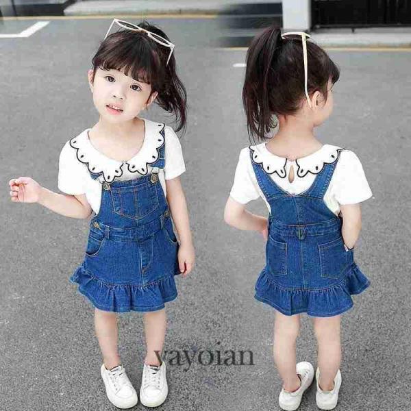 デニムサロペットキッズジャンパースカート子どもオールインワンサロペットデニムワンピース韓国子供服ダメージ加工90-140