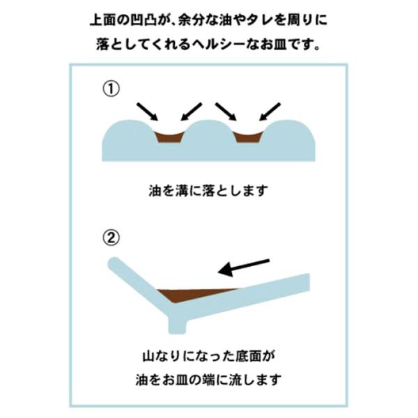 ●スリット状に配置された凹凸が、余分な油やタレを周りに落としてくれるヘルシーなお皿。