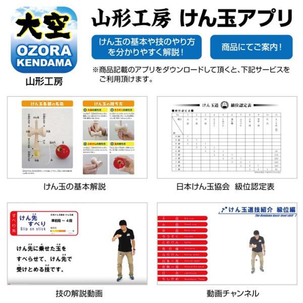 商品にてご案内の「山形工房けん玉アプリ」をダウンロードして頂ければ、日本語・英語で技やけん玉自体の解説、HOWTO動画、文化紹介動画等を見て、よりけん玉を楽しむことができます。