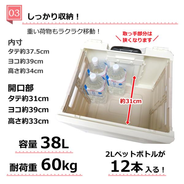 ●容量38L、耐荷重60kg、2Lのペットボトルが12本入ります!