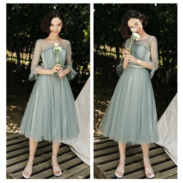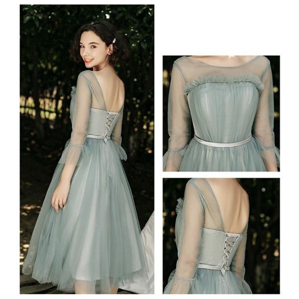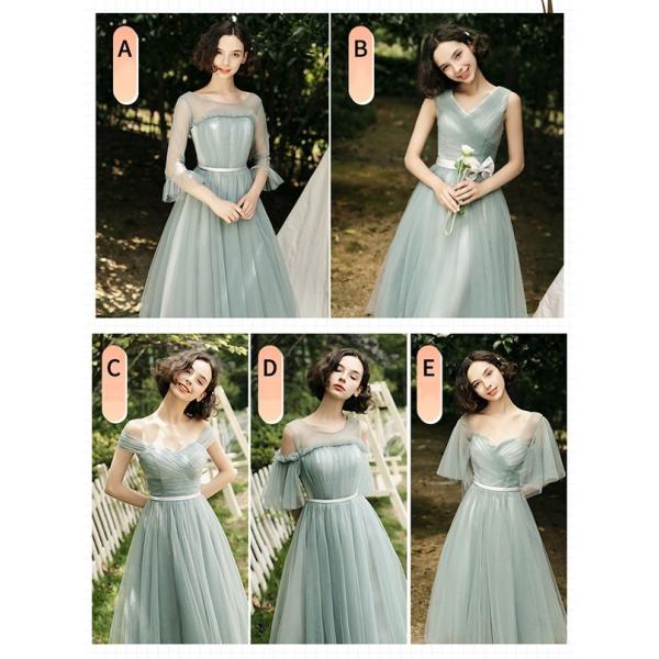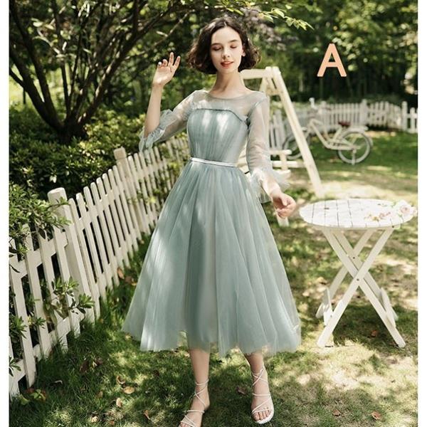 ブライズメイド ドレス ミモレ丈 5タイプ 大きいサイズ 袖あり Vネック ラウンドネック 小さいサイズ 体型カバー 肩出し 締め上げ 大人 フォーマル 結婚式 花嫁 森ガール 成人式 パーティー 二次会 演奏会 発表会 グリーンda121c7c7c7