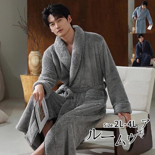 メンズ ガウン ルームウェア ふわふわ もこもこ パジャマ 冬 長袖 前開き ロング丈 ナイトガウン 着る毛布 部屋着 グレー ネイビー ブルー 2L 3L 4L
