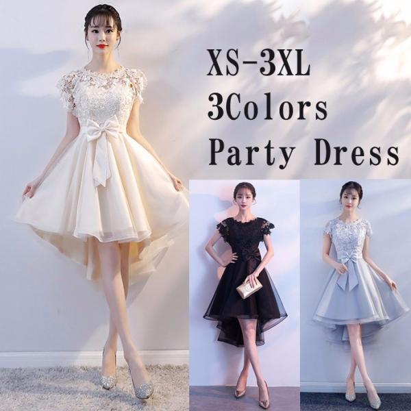 パーティードレス レディース ワンピース Aライン フィッシュテール アシンメトリー 大きいサイズ ラウンド バフスリーブ レース フォーマル 結婚式 演奏会 大人