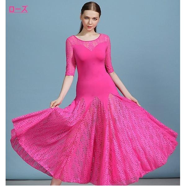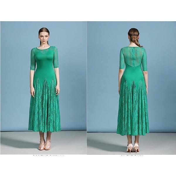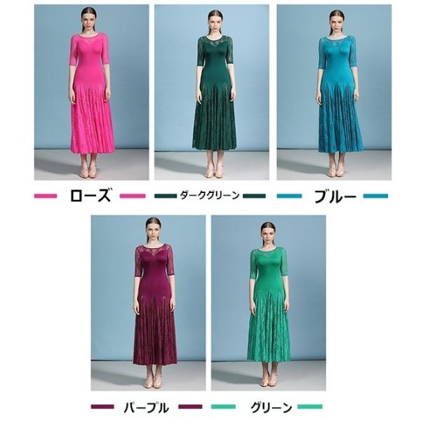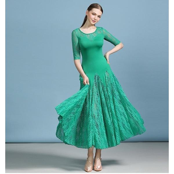 全5色 社交ダンスドレス 社交ダンス衣装 ロングワンピース 社交ダンスワンピース 練習着 パーティー衣装 レース 伸縮素材 広がる裾 ストレッチ 大きいサイズ スタンダードダンス ワルツ タンゴ ブルー グリーン ローズ パープルdm056s1