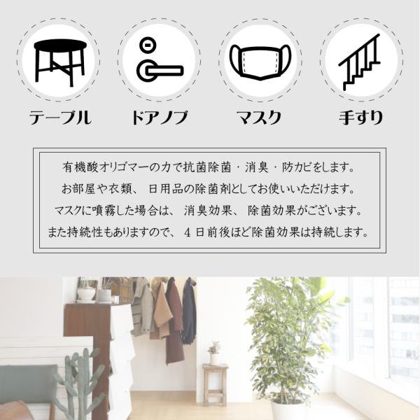 テーブルやドアノブ、手すりなどのお部屋周りや衣類・マスクなど日用品の除菌剤としてお使い頂けます。