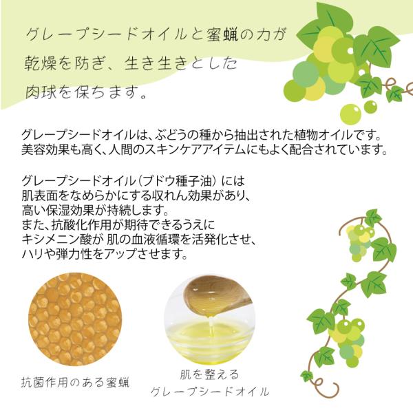 ●グレープシードルオイルと蜜蝋の力が乾燥を防ぎ、生き生きとした肉球を保ちます。