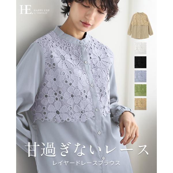 レースブラウス レディース トップス 長袖 バンドカラー 無地 シンプル ブラウス シャツ レース 体型カバー メール便可(1点まで)[M便 1/1](メ)