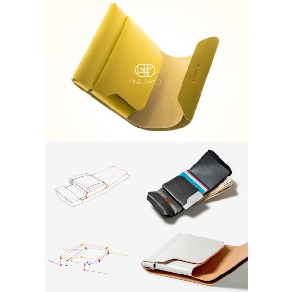 路線図をイメージしたパターン設計から、METROと名付けられた2つ折りの財布です。ホックや金具を使用しないシンプルでフラットなフォルム。革を折りたたんで作られており、4つの収納がパズルのようにかみ合って収まる構造。機能と収納をなぞるように革のコバ(エッジ)が走り、重なり、枝分かれしてデザインをかたどります。
