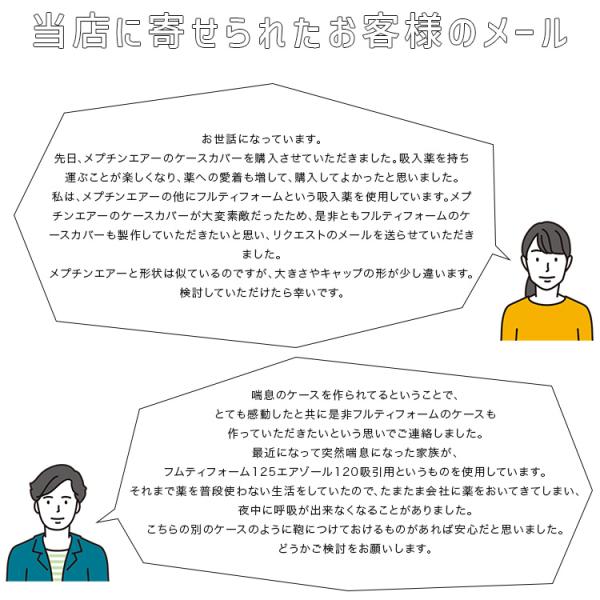 お薬を自然に持ち歩け、必要な時にはすぐに使える。お客様のご要望から生まれた、フルティフォーム用ケースです。薬を落とす不安を軽減するため、ストラップを付けてバッグの内側や腰からぶら下げれる様にデザインしました。