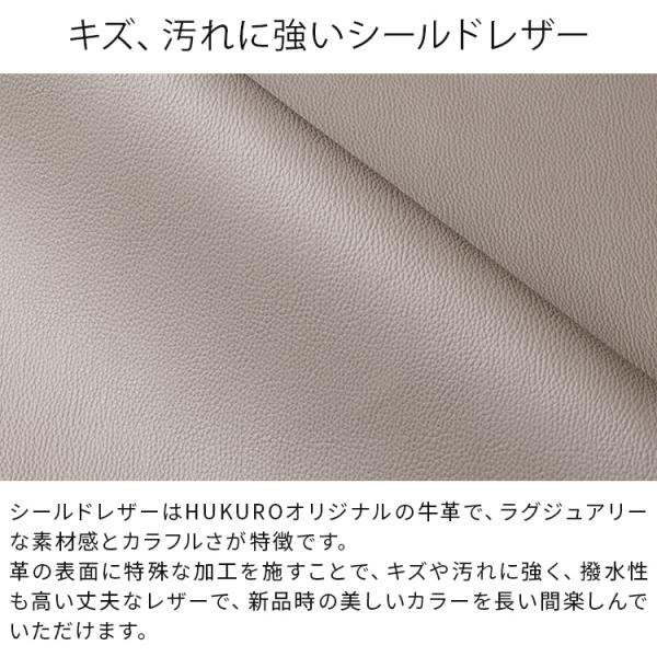 HUKUROオリジナルの牛革(シールドレザー)は、ラグジュアリーな素材感とカラフルさが特徴です。キズや汚れに強く、撥水性も高い丈夫な素材です。新品時の美しいカラーを長くお楽しみいただけます。