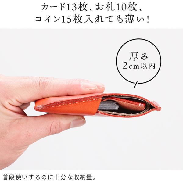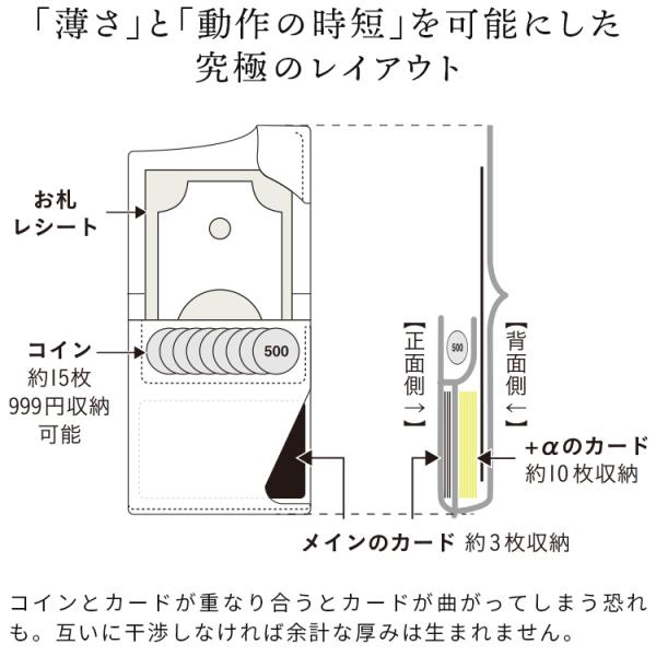 ワンアクションですべてが完結!キャッシュレス時代にピッタリの薄い時短財布です。普段使いできる十分な収納量を備えながらも、厚みは2cm以内に収まるというコンパクト設計。