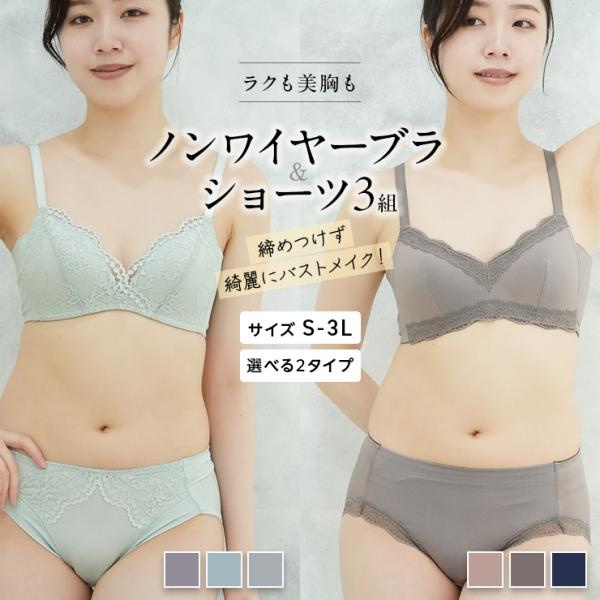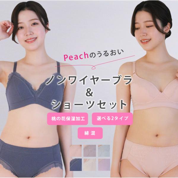 ブラジャー 桃の花保湿加工 ノンワイヤーブラ&ショーツセット 三角カップ 丸カップワイヤー 綿混 上下セット 下着 ピーチ ジャコンヌ jaconne 【3062】
