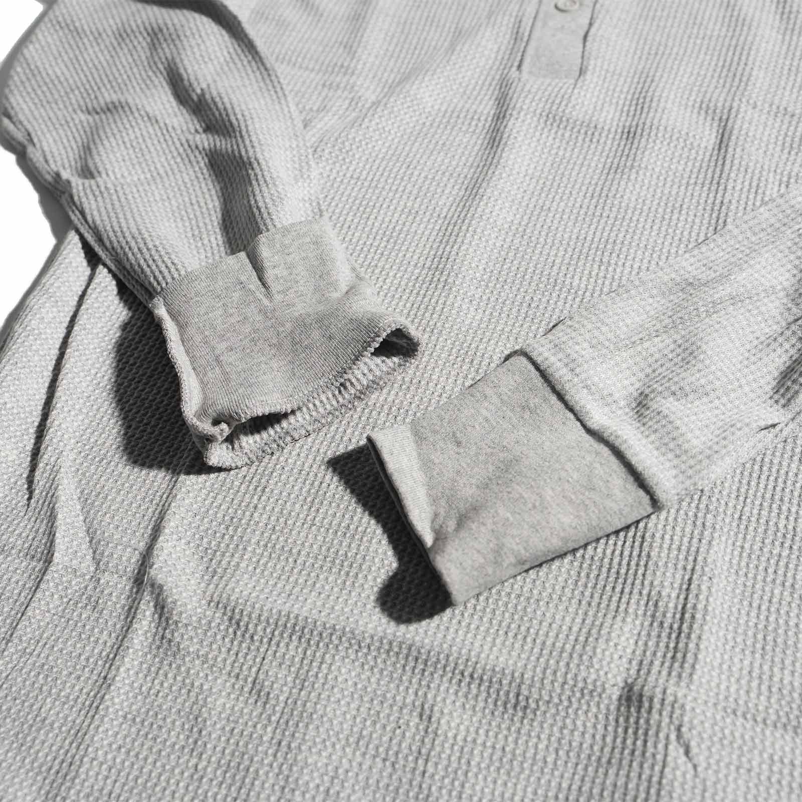 インデラのベーシックなサーマルウェア「ロングジョン」シリーズに、ヘンリーネックタイプ「811PS」が新登場。素材は「810」と同様、ソフトな肌触りと高い保温性を兼ね備えた65/35の綿ポリワッフルサーマルを採用しています。首元はボタンと生地を共色で仕上げ、適度なアクセントを加えたヘンリーネックデザイン。シャツのインナーとして、ちらりと覗かせるレイヤーコーディネートに最適です。冬の肌着として、ぜひ複数枚揃えておきたいアイテムです。