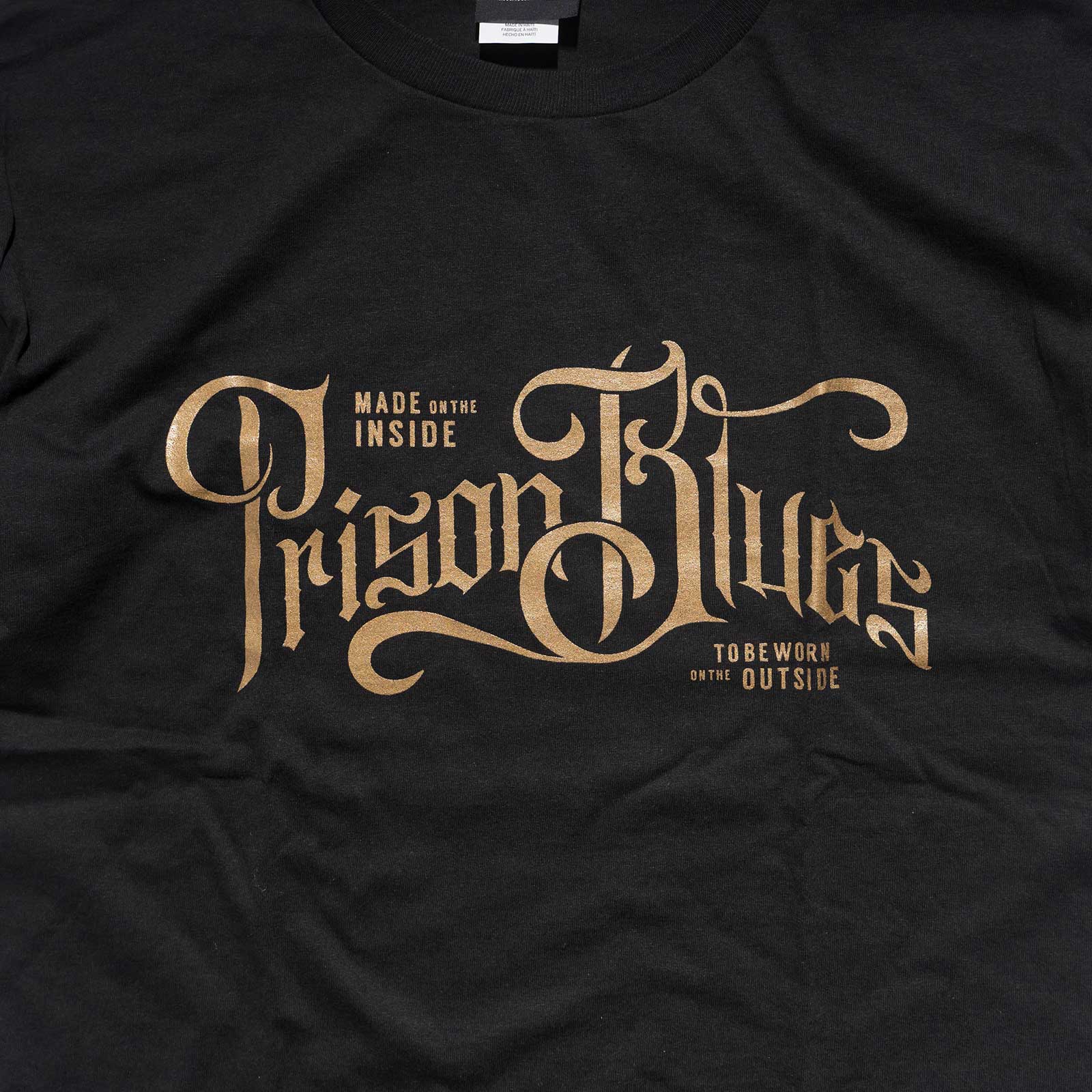 プリズンブルースの半袖プリントTシャツ「スクリプトロゴ」。こちらはトライバルフォントを用いた新デザインのブランドロゴがフロントに配されたTシャツ。どこか悪っぽさを漂わせつつ、ブラックボディにゴールドの箔プリントという配色により、ラグジュアリーな雰囲気に仕上がっています。