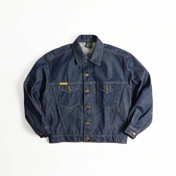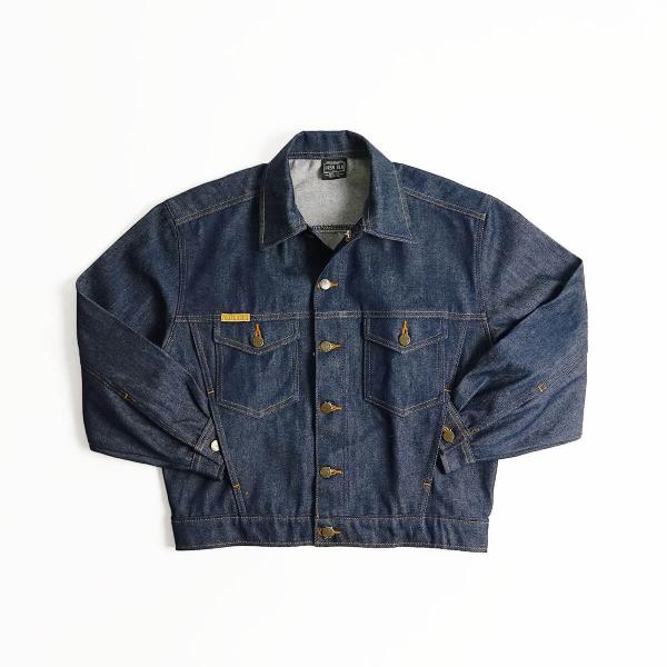 プリズンブルースより、囚人達のハンドメイドで作られたトラッカージャケット。外パッチで施された胸フラップポケットに加え、胸から下のフロントパネルを二重に施し、斜めに裁断された外生地の端部分がハンドポケットの入り口となる独自のパネリングが目を惹きます。他モデル同様、14.75オンスの超ヘビーなリジッドデニムを、各所ダブルステッチで縫製したタフな作りが最大の魅力。ステッチはコントラストの効いたオレンジで、負荷がかかる部分に同色のバータック、右胸織りネーム、メタルボタンは全て刻印入り。身幅、腕回り共にかなりゆったり作られた、クラッシックなアメリカンシルエット。とにかく重厚なので、エイジングも楽しみな一着。同ブランドパンツとのセットアップコーデもおすすめです。XSサイズは当店別注になります。