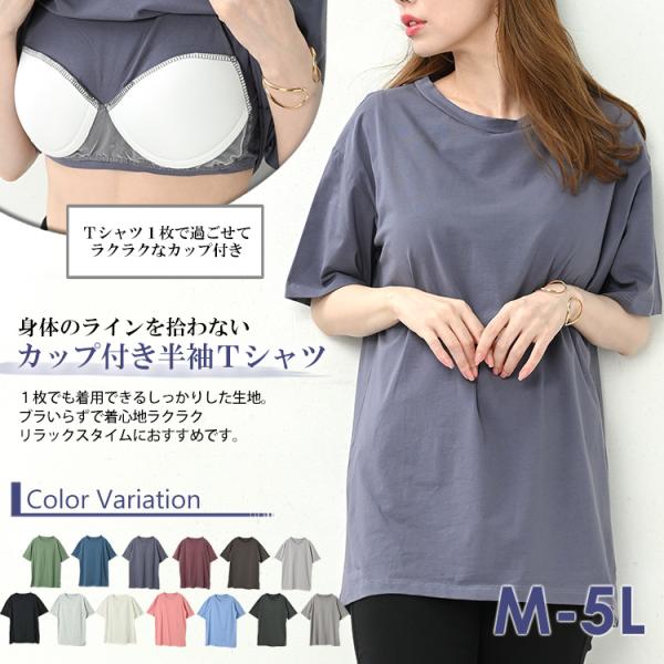 Tシャツ 大きいサイズ レディース メール便送料無料 カップ付き 半袖 Uネック 無地 トップス M L LL 3L 4L 5L
