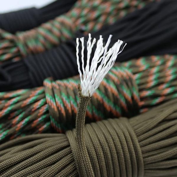 パラコードとはパラシュートコードの略称で、その名の通りパラシュートのキャノピー(傘)と人を繋ぐロープのことです。耐久性が強い上に軽く、乾きやすいという特徴から、魚釣りの糸(中の糸を引き出して使用)、車の牽引、テントロープ、スニーカーの紐など様々な用途に使用されます。