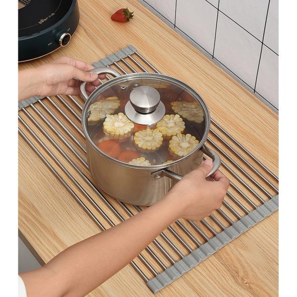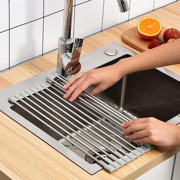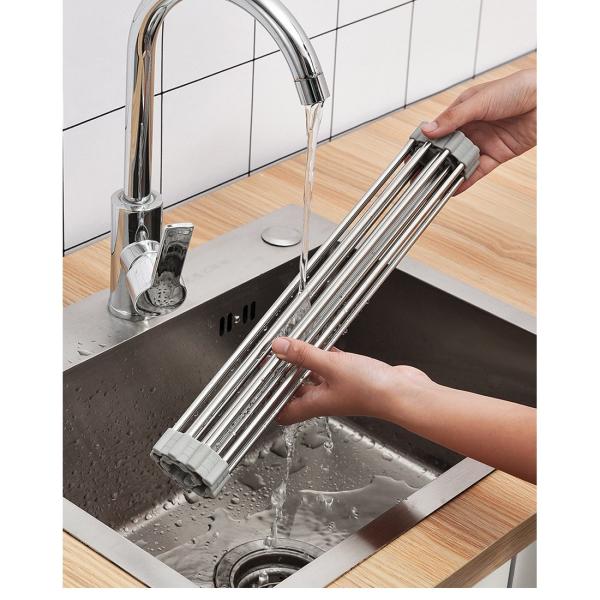 ・【くるくる巻いて収納簡単】:使い終わったら、くるくると巻いてコンパクトに収納可能。引き出しなどのちょっとしたスペースにも片づけられ、狭いキッチンでも場所を取りません、使いたい幅にフレキシブルに折り畳めるので、洗い物の量に合わせてサイズを調節できます。