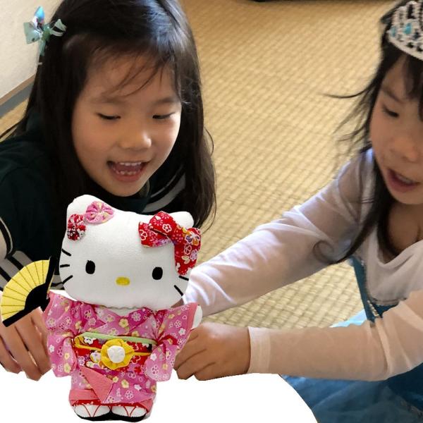 ちりめん生地の着物を着た可愛い和風キティちゃん人形。