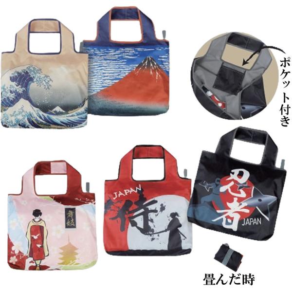 和柄 エコバッグ ポケット付き おもてなし バッグ 和風エコバッグ コンパクト 底にマチ付 日本のお土産 葛飾北斎 浪裏 赤富士 舞妓 侍 忍者 送料無料