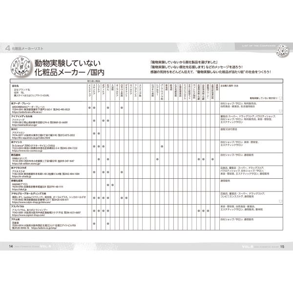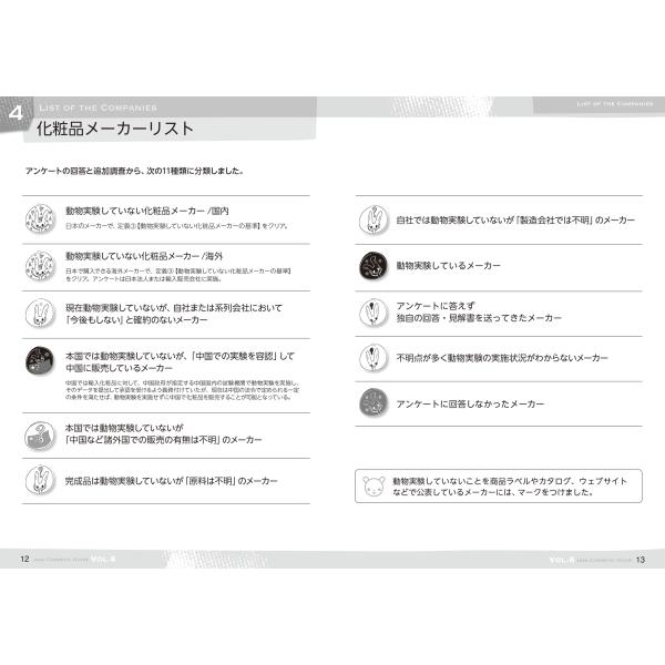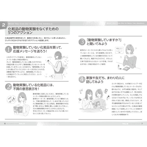 JAVA独自のアンケートによって、化粧品メーカーなどを「動物実験していない」「動物実験している」に分類した『動物たちに優しい化粧品や日用品を選ぶためのガイドブック』 です。1998年にVol.1を発行、今刊でVol.6となりました。
