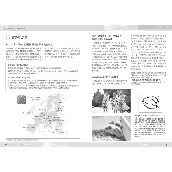 Vol.6では、1,000社以上の日本の化粧品メーカーと海外ブランドの化粧品を輸入販売する支社・代理店に対して、「JAVA化粧品アンケート2023」を2023年9月〜2024年6月に実施。その回答と、追加した調査結果を集計して作成しました。 さらに化粧品の動物実験の実態や化粧品製造販売のシステム、動物実験をめぐる海外の動き、動物実験代替法などに関する記事なども掲載した、充実の一冊です。