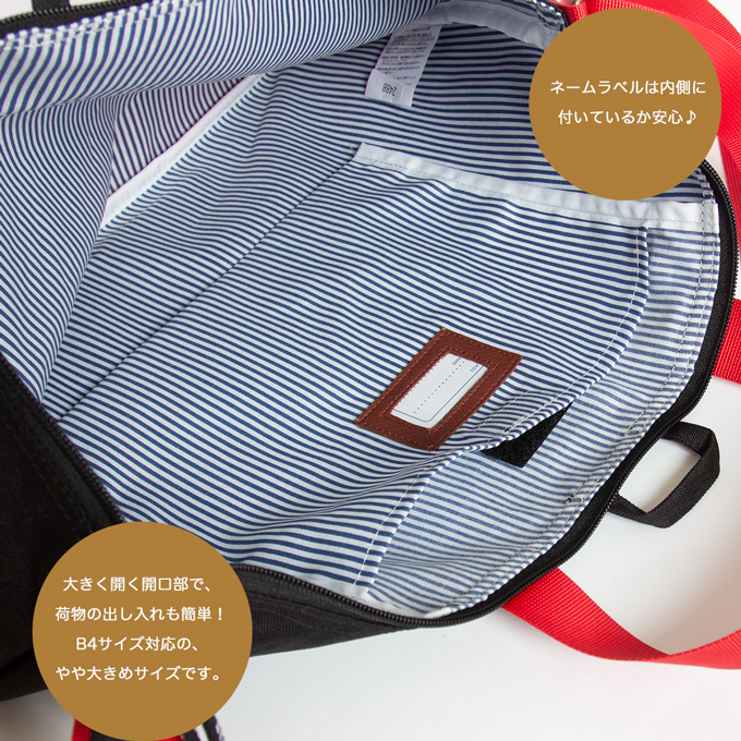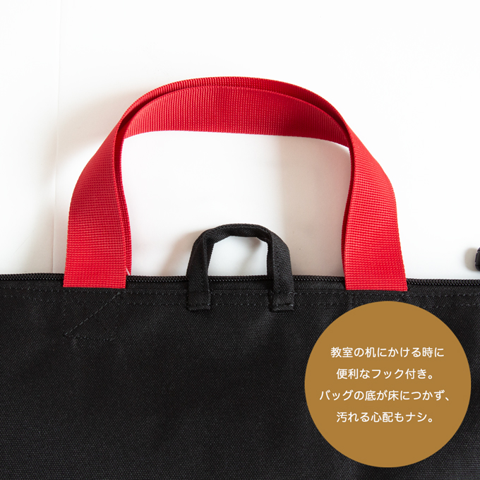 Leeロゴとバイカラーが可愛いレッスンバッグ。 B4サイズも入る、ややゆったりめサイズで、教科書やノートもすっぽり入る収納力。トートバッグとしても、ショルダーバッグとしても使える2way仕様で、荷物のかさばる通園や通学にぴったりです。中吊りのインナーポケットは、小物類も入れられて便利なデザイン。教室の机にかけるときは、机用のフックにひっかければ、バッグの底が床につかず、清潔に使用できます。