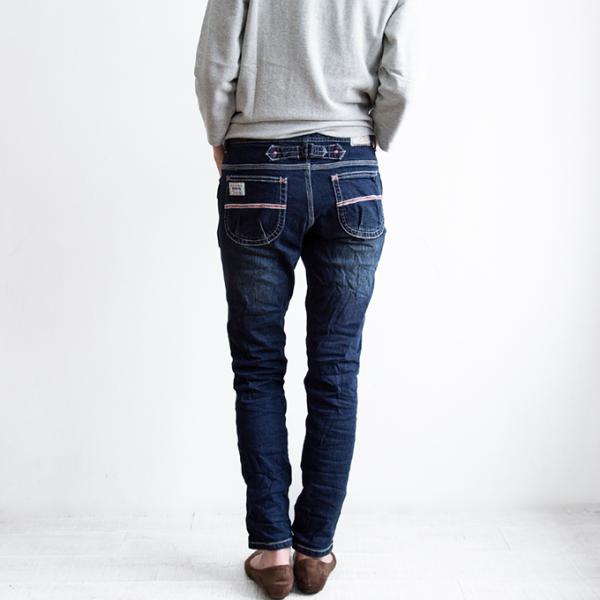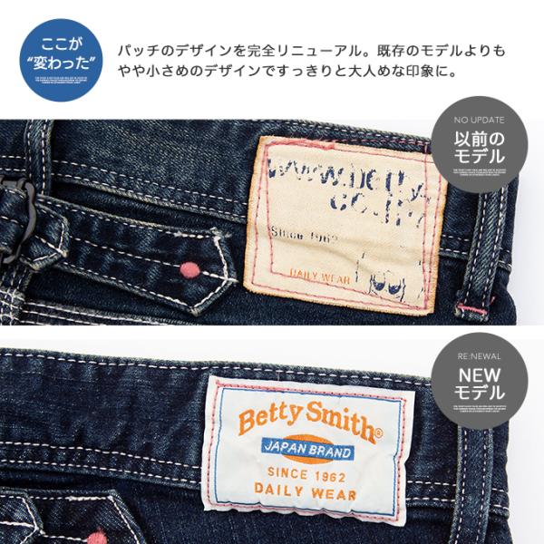 従来のモデルに比べさらに穿きやすさを追求しストレッチ性をアップ。足がとっても綺麗に見える、ベティスミスが研究し尽くしたテーパードとスキニーの間のようなオリジナルのシルエットに人気のノーススタイルのデザインを取り入れて、腰回りは程よくゆるく、窮屈感なく穿ける人気の『ゆるスキニー』はどんなスタイルにも大活躍です。「いつもより脚が細く見える」と好評頂いている「ゆるスキニー」の少しゆとりのある腰周りから足先に向かって細くなる独特のシルエットは健在。気になる太ももやお尻周りなどスッキリ穿きこなせます。身生地とポケットの生地を同じにすることでさらにスッキリと大人なデザインに。ホワイトステッチやピンク糸のカンヌキなどベティスミスらしい大人可愛いデザインは健在です!加工、デザイン、シルエットの3拍子揃った素敵デニムに仕上がっています。従来よりご好評を頂いております、腰回りにゆとりをもたせた絶妙なスキニーシルエットを現代的に改良し丈感、シルエットともにさらに美しくトレンド感を持たせた仕上がりになっています。