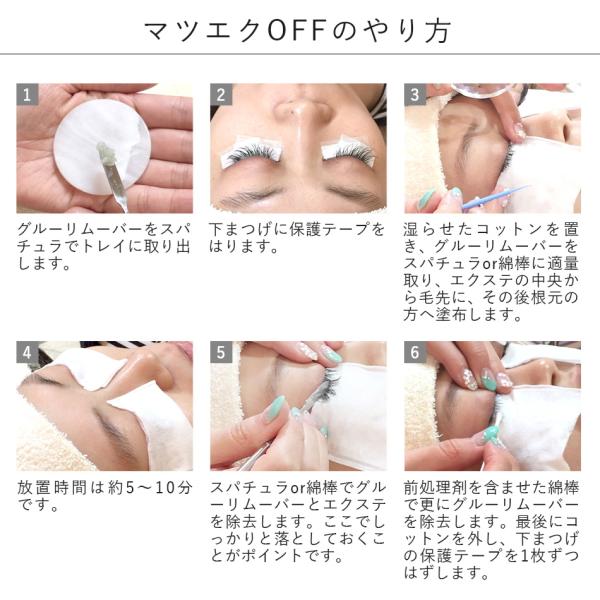 【使用方法】装着後のエクステのリムーバーや余分についたグルーを安全にとる事ができます。綿棒などで適量にとり、接着部分に塗ってから2、3分程度時間をおいて繰り返しなでるように、優しくそっとリムーブしてください。完全リムーブの場合は、適量に塗った後、浸透が早まるようにラップを上からかぶせ、10分程度置いた後、同様にリムーブしてください。