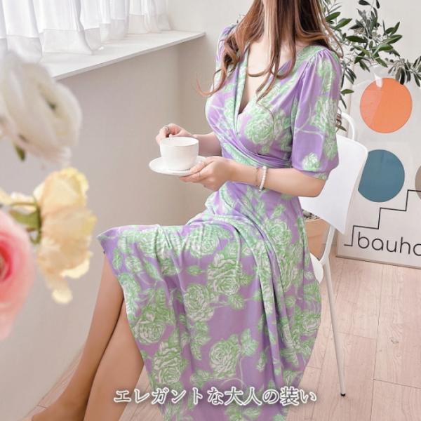 ワンピース レディース 上品 フレアー ロング 花柄 カシュクール 五分パフ袖 30代 40代 ファッション セクシー 高級感 高品質 春夏 新作