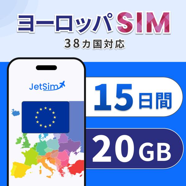 【JetSim】 ヨーロッパ 38カ国 SIM 15日間 20GB 高速データ通信 フランス・イタリア・イギリス対応 テザリング可 簡単設定 ジェットシム