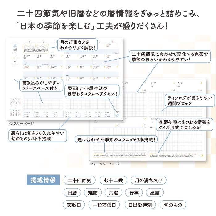 ・二十四節気や旧暦などの暦情報をぎゅっと詰め込み、「日本の季節を楽しむ」工夫が盛りだくさん!