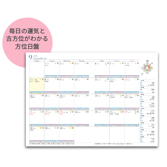 スケジュールページには、六曜、二十四節気、雑節、月の満ち欠け、天中殺(よくない日)、一粒万倍日、天赦日、天一天上などの選日も掲載。
