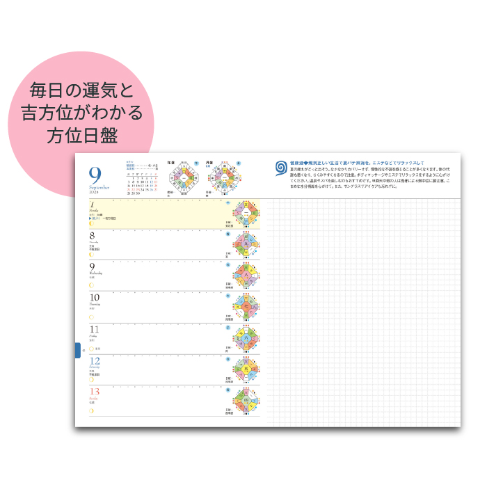 さらに週間のページには、毎日の運気と吉方位がわかる方位盤、日破(よくない方向)を掲載。