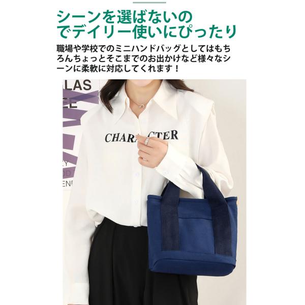 ちょっとしたお出かけ時にあると便利なキャンバスミニトートバッグ。仕切りがあるので荷物を綺麗に整理整頓して入れられます。ころんとコンパクトな見た目とは裏腹に内側は3つに分かれた仕切り&2つのオープンポケット付き!さらにマチ広設定なのでたっぷり収納できます! iPad miniが立てて収納できます。マイクロ傘、長財布、5.5インチ以内のスマホなども入るので職場や学校でのミニハンドバッグとしてはもちろんちょっとそこまでのお出かけなど様々なシーンに柔軟に対応してくれます!選べる5色展開!ぜひお気に入りのカラーを見つけてください。通勤、通学やお出かけなどに使いやすいサイズ感なので、年齢問わず使えるバッグです。